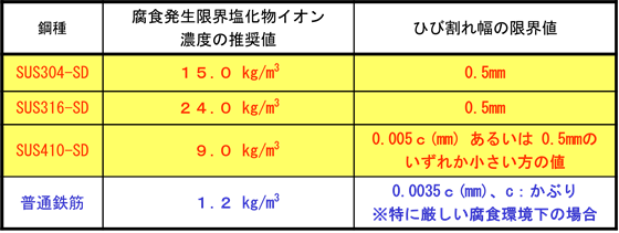 ステンレス鉄筋は土木学会設計施工指針(案)において、腐食発生限界塩化物イオン濃度とひび割れ幅の限界値が設けられています。ステンレス鉄器員の鋼種によって異なりますが、極めて高い耐食性を有することを利点として、厳しい腐食性環境下での高耐久構造物を構築を可能とします。▼ステンレス鉄筋の鋼種および材質