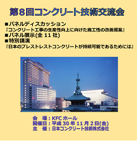 技術交流会は、工業会のオリジナル技術・商品、賛助会員の新技術などの技術情報の提供および活発な意見・情報交換の場とし、会員各社の積極的な営業発信の拠点となることを目的として日本コンクリート技術株式会社と合同で開催しております。各回の開催内容につきましては、プログラム(pdf)をご参照ください。